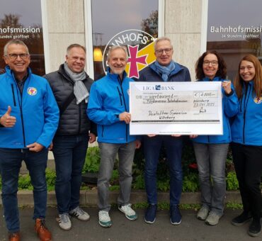 Zur traditionellen Scheckübergabe waren neben Thomas Dittmeier Firmenkundenberaterin und Initiatorin Katrin Böse sowie Prokurist Oliver Guth an den Würzburger Bahnhof gekommen. Helmut Lang und Andreas Müller vom neuen Vorstandsteam des Fördervereins Bahnhofsmission, nutzten die Gelegenheit, um sich dem treuen Spender persönlich vorzustellen, und um sich mit Dittmeier über neue Ideen zu Hilfsprojekten in der Bahnhofsmission auszutauschen. „Vielen Dank für Ihre großzügige Spende, die Sie dem Förderverein Bahnhofsmission auch in diesem Jahr wieder zukommen lassen“, sagte Helmut Lang. Dass Dittmeier weitere Spenden an den Förderverein für die kommenden Jahren bereits zugesagt habe, trage zur Planungssicherheit der Einrichtung bei.